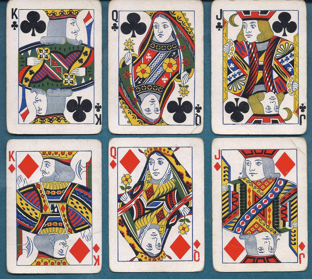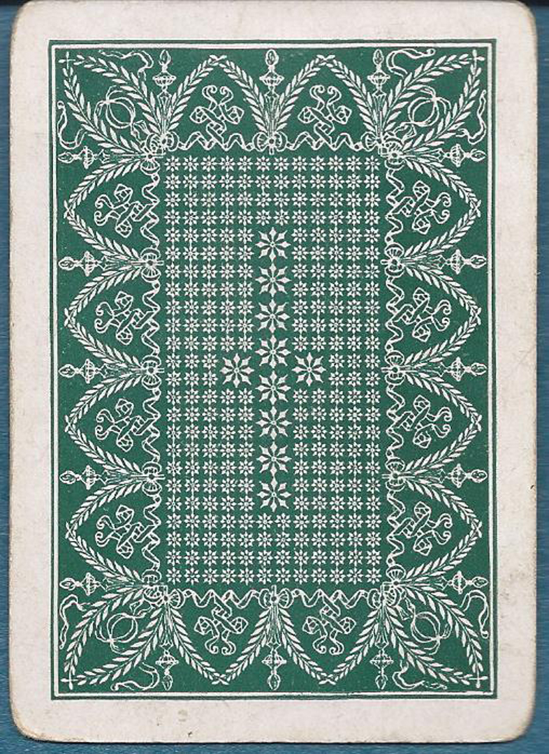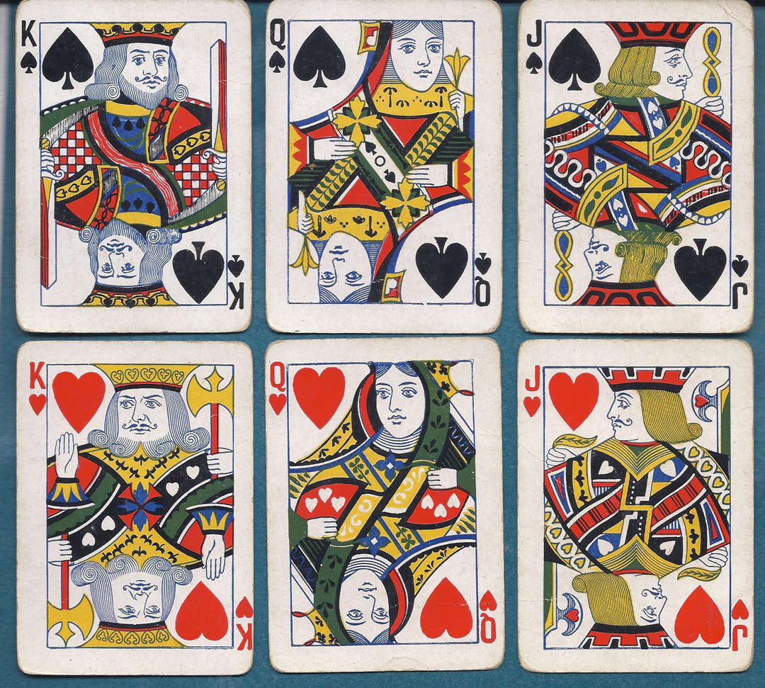 We do not see many decks from this small maker. It has a very attractive AS and features special court designs. Cards have soil and wear and light creases. No Joker and no box.