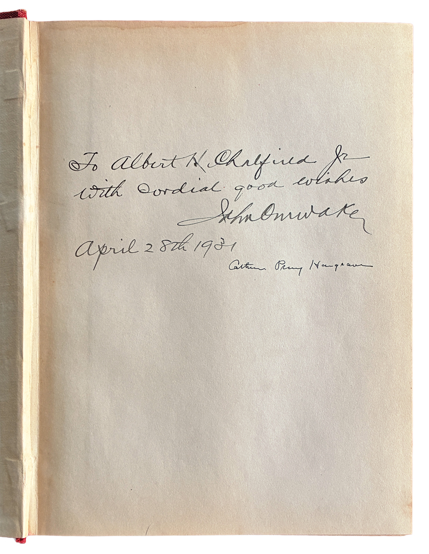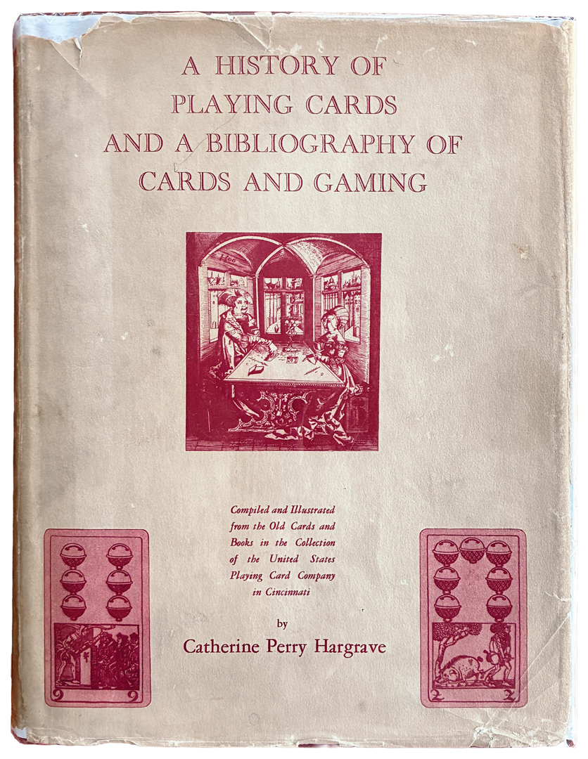 Classic Hargrave book on playing cards, 468 page hardback book in wonderful condition. Signed by John Omwake, Chairman of USPC and Catherine Perry Hargrave (1930). Dust jacket has edge wear. Both signatures make this edition a standout for collectors. Her book also serves as a practical catalog of what was intended to be included in the USPC archive, offering a snapshot of the collection at that time.