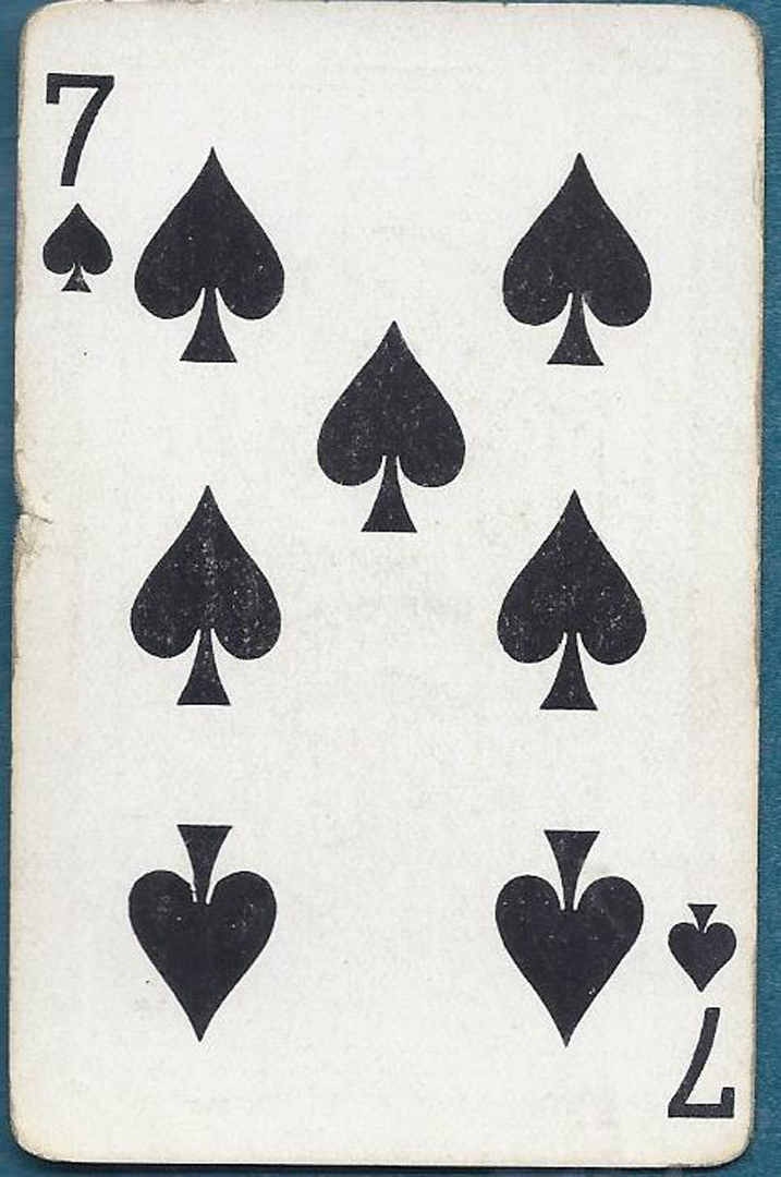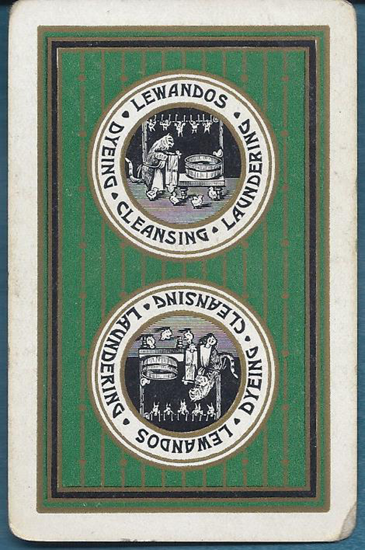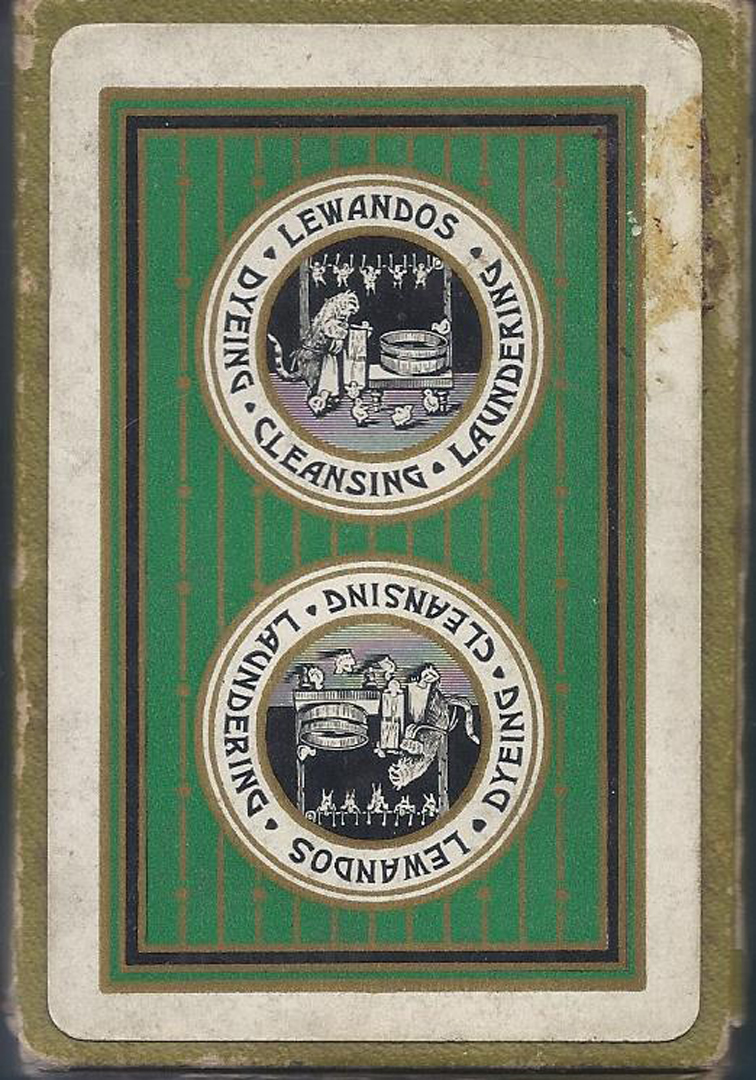 Early narrow advertising deck with very attractive Ace, Joker and extra card listing shop services and locations. Cards have edge wear and soil (gold edges well-worn); 7S has edge ding.