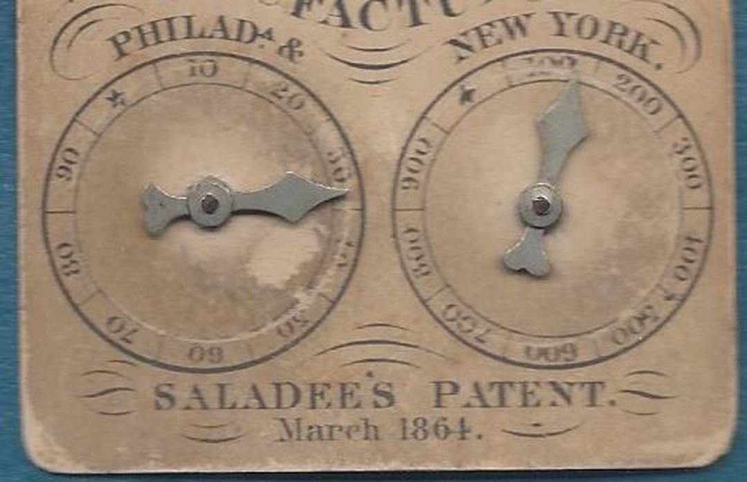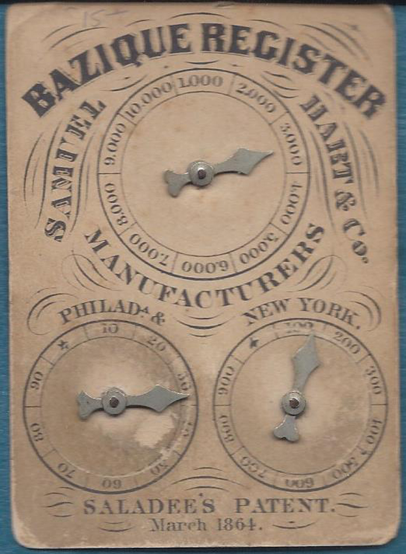Scoring Register invented by Cyrus W. Saladee and introduced by Samuel Hart in 1864. Some staining and light edge wear but dials work smoothly. Nice playing card ephemera from Civil War period.